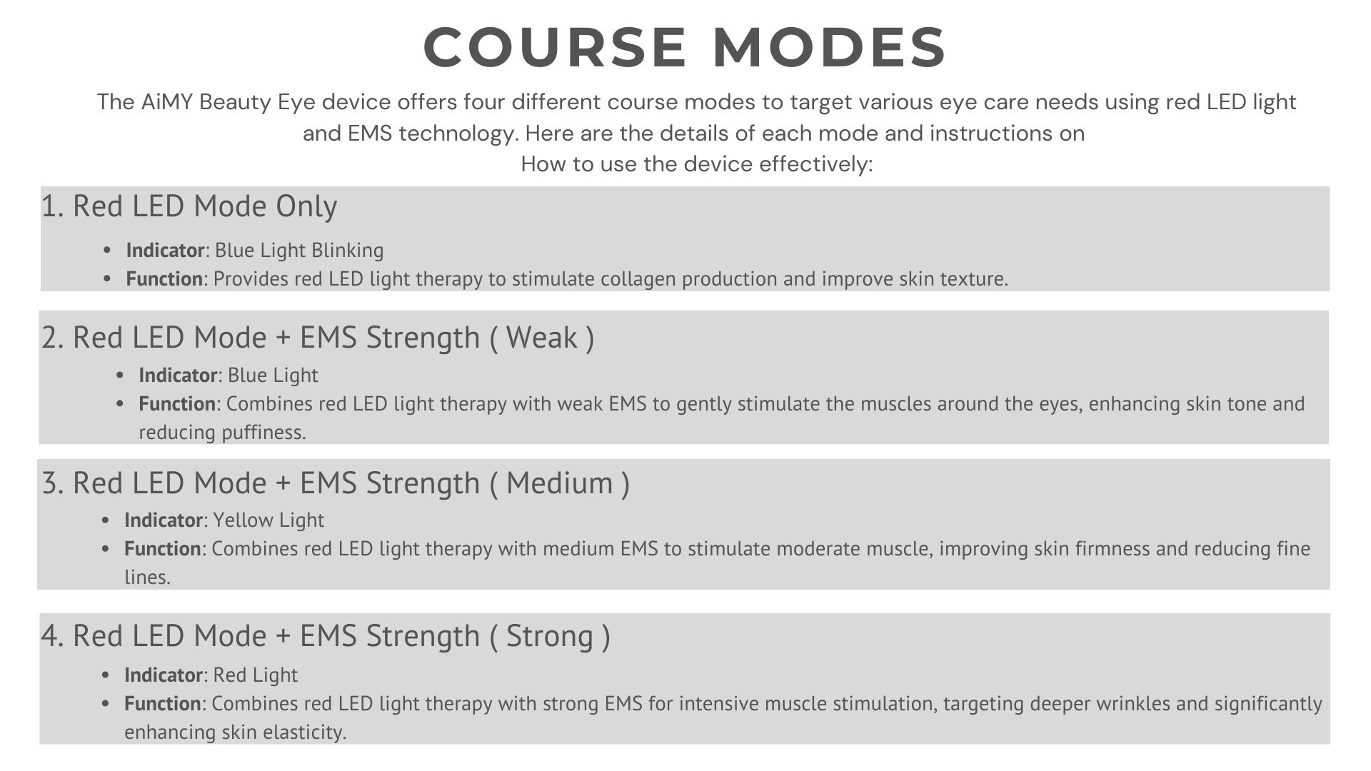 4 courses: red LED mode only, red LED mode + EMS (weak, medium, strong)
